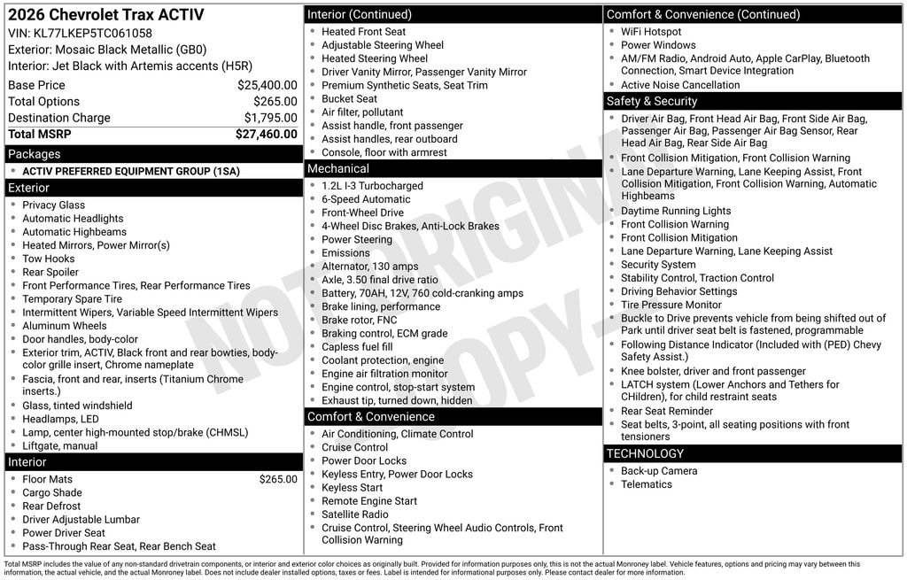 Trax ACTIV, 8-Way Power Driver Seat Adjuster, Alloy wheels, Automatic temperature control, Exterior Parking Camera Rear, Fully automatic headlights, Heated Driver and Front Passenger Seats, Premium audio system: Chevrolet Infotainment 3, Remote Keyless Entry, SiriusXM Trial Subscription, Speed control, Steering wheel mounted audio controls, Wheels: 18 Black-Painted Aluminum. Price includes the following rebates:$500 - Customer Cash. Exp. 04/30/2026