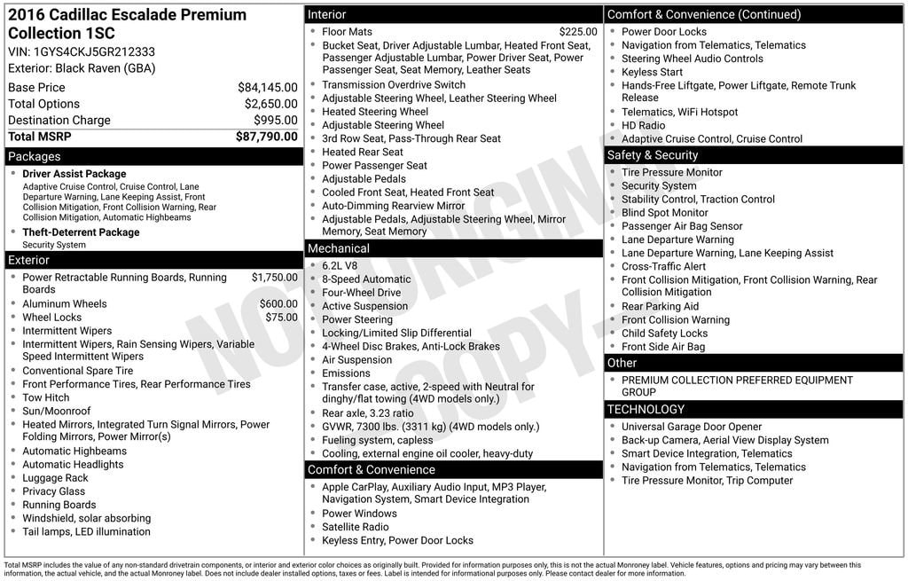 Clean CARFAX! This Cadillac Escalade Premium has many features and is well equipped including, Apple CarPlay, Power Sunroof, Heated Steering Wheel, Heated Seats, Ventilated Seats, Leather Seats, Captain's Chairs, Adaptive Cruise Control, Power Liftgate, 4-Wheel Drive, Backup Camera, 16 Speakers, 1st 2nd & 3rd Row Floor Mats (LPO), 22 x 9 7-Spoke Ultra-Bright Aluminum Wheels, A/V remote, Adaptive Full-Speed Range Cruise Control, Adaptive Suspension, Air Conditioning, Apple CarPlay, Auto High-beam Headlights, Auto-dimming door mirrors, Auto-leveling suspension, Automatic Safety Belt Tightening, Automatic temperature control, Bose Centerpoint Surround Sound System, Brake assist, CD player, Delay-off headlights, Driver Assist Package, DVD-Audio, Electronic Powered Parking Brake, Electronic Stability Control, Exterior Parking Camera Rear, Forward Collision Alert, Front & Rear Automatic Braking, HD Radio, Headphones, Heads-Up Display, Heated & Cooled Front Bucket Seats, Heated door mirrors, Heated front seats, Heated Rear Seats, Heated steering wheel, Illuminated Door Handles, IntelliBeam Headlamps, Lane Departure Warning System, Lane Keep Assist, Leather Seating Surfaces, Magnetic Ride Control Suspension, Memory seat, Navigation System, NavTraffic, Pedal memory, Power door mirrors, Power Liftgate, Power passenger seat, Power Tilt-Sliding Sunroof w/Express-Open/Close, Preferred Equipment Group 1SC, Radio: Cadillac CUE Info/Media Ctrl Sys w/Embd Nav, Rear air conditioning, Rear audio controls, Rear Cross-Traffic Alert, Rear Seat Entertainment System, Reconfigurable 4-Color Head-Up Display, Second Row Bucket Seats, Side Blind Zone Alert, SiriusXM Satellite Radio, Split folding rear seat, Theft-Deterrent Package, VAC Power 17 Disc Brakes, Ventilated front seats.