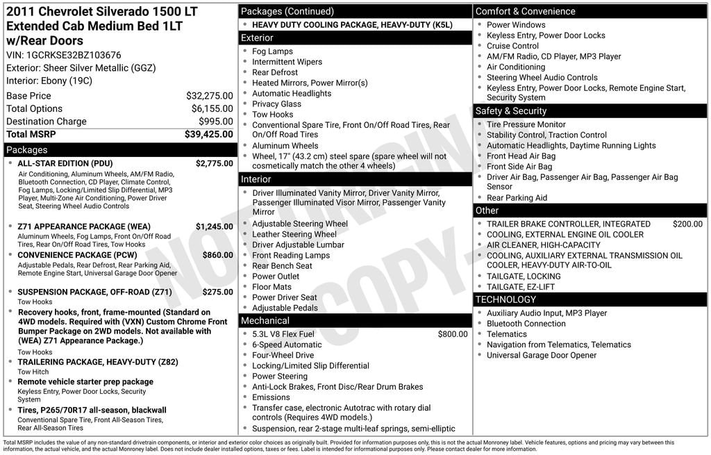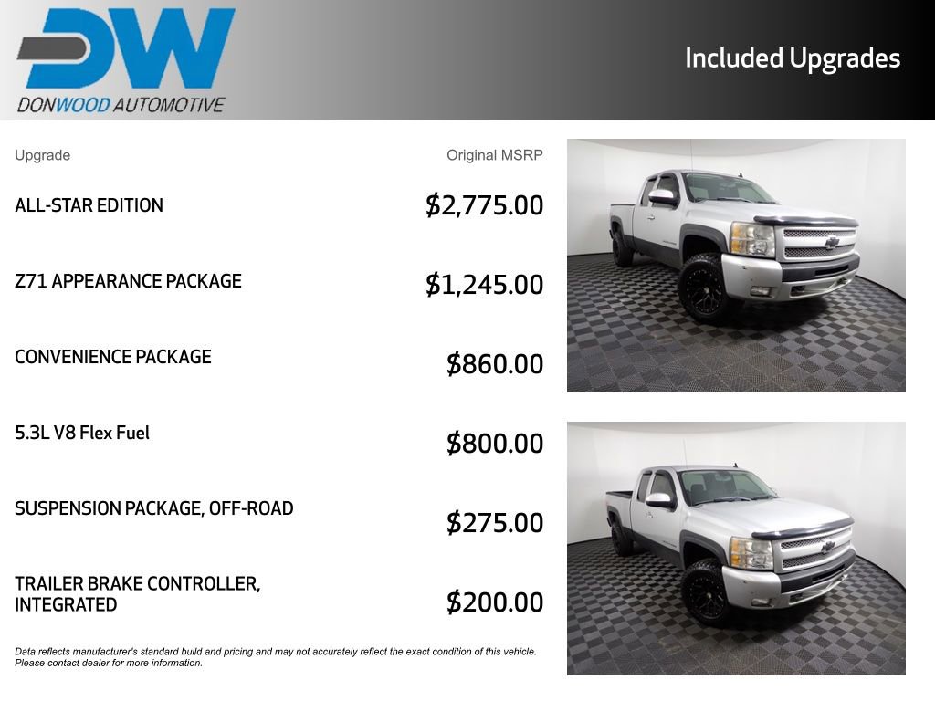 Clean CARFAX!, 17 x 7.5 5-Spoke Aluminum Wheels, 18 x 8 Aluminum Wheels, 6 Speaker Audio System Feature, All-Star Edition, AM/FM Stereo w/CD Player & MP3 Playback, Bluetooth® For Phone, Body-Colored Bodyside Moldings, Body-Colored Door Handles, Body-Colored Grille w/Unique Chrome Insert, Chrome Grille Surround, Chrome Recovery Hooks, Color-Keyed Carpeting w/Rubberized Vinyl Floormats, Convenience Package, Driver & Front Passenger Illuminated Visor Mirrors, Driver-Side Manual Lumbar Control Seat Adjuster, Dual-Zone Automatic Climate Control, Electric Rear-Window Defogger, Electronic Autotrac Transfer Case, Electronic Cruise Control w/Set & Resume Speed, EZ-Lift Tailgate, Front Halogen Fog Lamps, Heated Power-Adjustable Black Outside Mirrors, Heavy Duty Cooling Package, Heavy-Duty Air-to-Oil External Engine Oil Cooler, Heavy-Duty Auxiliary External Transmission Oil Cooler, Heavy-Duty Handling/Trailering Suspension Package, Heavy-Duty Rear Automatic Locking Differential, Heavy-Duty Trailering Package, Heavy-Duty Trailering Package (Retail), Leather-Wrapped Steering Wheel, Locking Tailgate, LT1 Equipment Group, Power Door Locks w/Remote Keyless Entry, Power Windows w/Driver Express-Down, Power-Adjustable Pedals For Accelerator & Brake, Rear Access Door Power Windows, Remote Keyless Entry w/2 Transmitters, Remote Vehicle Starter System, Skid Plate Package, Solar-Ray Deep-Tinted Glass, Spare Tire Lock, Speed control, Steering Wheel Mounted Audio Controls, Ultrasonic Rear Parking Assist w/Audible Warning, Z71 Appearance Package, Z71 Off-Road Package.