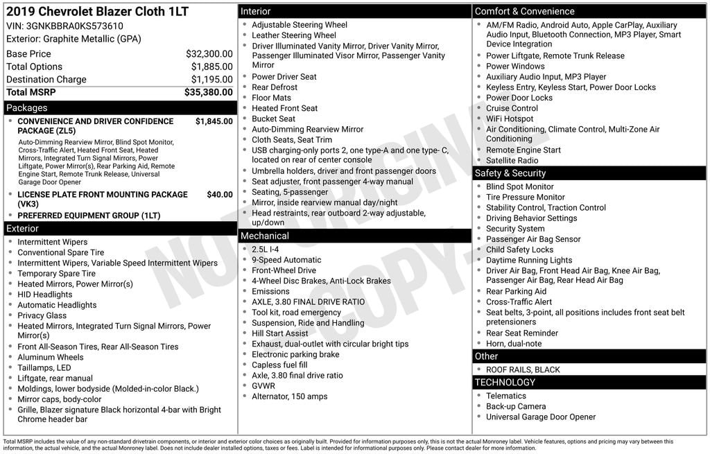 A short drive from Athens, Cambridge, Chillicothe, Circleville, Columbus, Lancaster, Logan, Marietta, Nelsonville, Newark, Pickerington, Sandusky, and Zanesville in Ohio, as well as Charleston, Clarksburg, Huntington, Morgantown, Parkersburg, Vienna, and Wheeling in West Virginia. 27350 Darl Rd. Rockbridge, OH 43149. Located in the Hocking Hills! Close to Ohio University! Vehicle: 2019 Chevrolet Blazer LT Price: 15000 (live market adjusted) CarFax: True, available today Stock#: J573610C | VIN Ending: 3GNKBBRA0KS573610 Delivery: Nationwide delivery available.