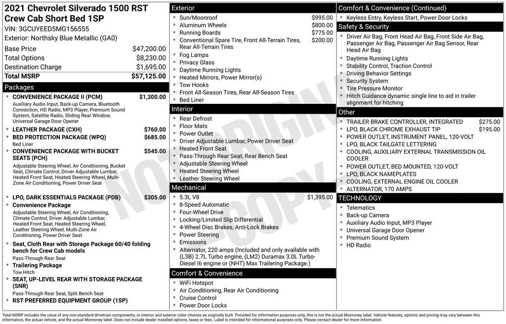 Clean CARFAX! CARFAX One-Owner! This Chevrolet Silverado 1500 RST has many features and is well equipped including, Power Sunroof, Heated Steering Wheel, Heated Seats, Leather Seats, Remote Vehicle Start, Navigation, Great Price, Backup Camera, Integrated Trailer Brake Controller, 4-Wheel Drive, 10-Way Power Driver Seat w/Lumbar, 12-Volt Rear Auxiliary Power Outlet, 120-Volt Instrument Panel Power Outlet, 2 USB Ports, 2 USB Ports (First Row), 20" Painted Aluminum Wheels w/Machine Face & Argent Metallic Pockets, 4-Wheel Disc Brakes, 4.2" Diagonal Color Display Driver Info Center, 4" Black Round Assist Steps (LPO), 6-Speaker Audio System, Air Conditioning, All-Star Edition, Apple CarPlay/Android Auto, Auto-Locking Rear Differential, Bed Protection Package, Black Name Plates (LPO), Black Tailgate CHEVROLET Lettering (LPO), Bluetooth® For Phone, Body Color Grille, Brake assist, Chevrolet Connected Access Capable, Chevytec Spray-On Black Bedliner, Cloth Rear Seat w/Storage Package, Compass, Convenience Package, Convenience Package II, Convenience Package w/Buckets Seats, Dark Essentials Package (LPO), Deep-Tinted Glass, Delay-off headlights, Dual-Zone Automatic Climate Control, Electric Rear-Window Defogger, Electrical Lock Control Steering Column, Electronic Cruise Control, Electronic Stability Control, EZ Lift Power Lock & Release Tailgate, Floor Mounted Center Console, Front Bucket Seats, Front Center Armrest w/Storage, Front Frame-Mounted Black Recovery Hooks, Front LED Fog Lamps, Front Rubberized Vinyl Floor Mats, Fully automatic headlights, HD Radio, HD Rear Vision Camera, Heated door mirrors, Heated Driver & Front Outboard Passenger Seats, Heated front seats, Heated Steering Wheel, Heated steering wheel, Heavy Duty Suspension, High Gloss Black Mirror Caps, Hitch Guidance, Integrated Trailer Brake Controller, Keyless Open & Start, Leather Package, Leather Wrapped Steering Wheel, Leather-Appointed Front Seat Trim, LED Cargo Area Lighting, Manual Tilt/Telescoping Steering Column, OnStar & Chevrolet Connected Services Capable, Overhead console, Panic Alarm, Power Door Locks, Power door mirrors, Power driver seat, Power Front Windows w/Driver Express Up/Down, Power Front Windows w/Passenger Express Down, Power Rear Windows w/Express Down, Power Sliding Rear Window w/Rear Defogger, Power Sunroof, Preferred Equipment Group 1SP, Premium Bose 7-Speaker Sound System, Radio: Chevrolet Infotainment 3 Plus System, Rear 60/40 Folding Bench Seat (Folds Up), Rear Dual USB Charging-Only Ports, Rear Rubberized-Vinyl Floor Mats, Rear Vision Camera, Rear Wheelhouse Liners, Remote Keyless Entry, Remote Vehicle Starter System, Security System, SiriusXM Radio, SiriusXM w/360L, Speed control, Speed-Sensing Steering, Standard Tailgate, Steering Wheel Audio Controls, Steering wheel mounted audio controls, Theft Deterrent System (Unauthorized Entry), Traction Control, Trailering Package, Trip Computer, Universal Home Remote, Up-Level Rear Seat w/Storage Package, Variably intermittent wipers, Wireless Phone Projection.