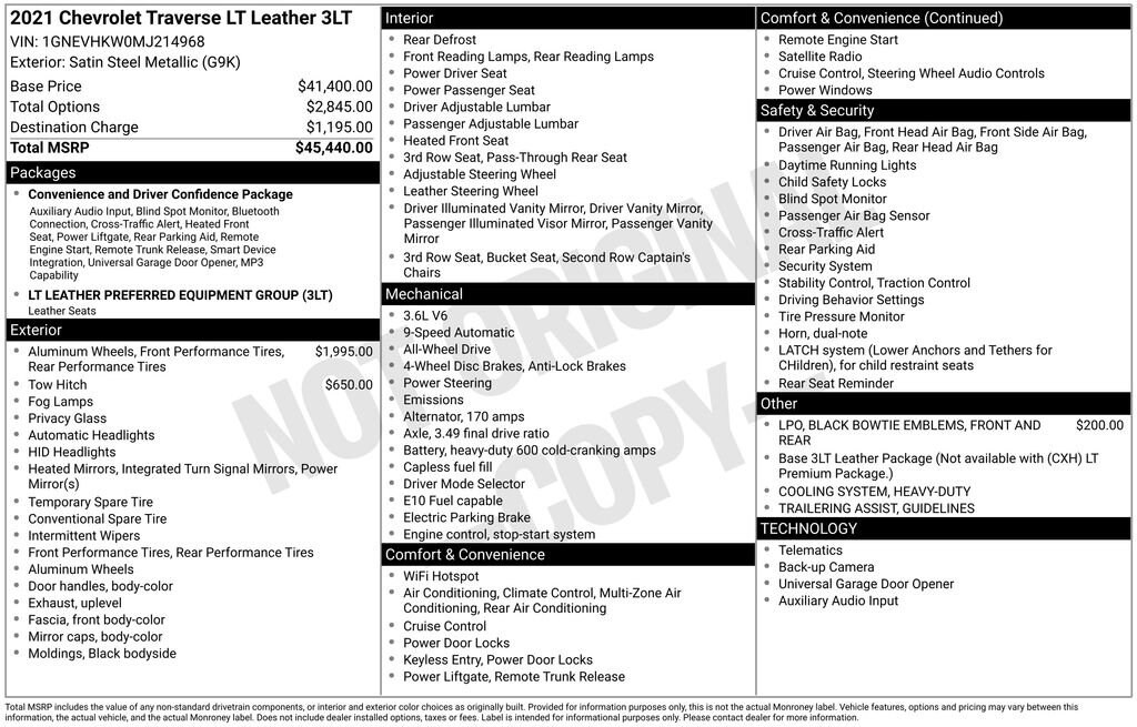 A short drive from Athens, Cambridge, Chillicothe, Circleville, Columbus, Lancaster, Logan, Marietta, Nelsonville, Newark, Pickerington, Pomeroy, and Zanesville in Ohio, as well as Charleston, Clarksburg, Huntington, Morgantown, Parkersburg, Vienna, and Wheeling in West Virginia. 2065 East State St. Athens, OH 45701. Near Ohio University! Down the road from Hocking Hills! Vehicle: 2021 Chevrolet Traverse LT Leather Price: 21887 (live market adjusted) CarFax: True, available today Stock#: F369371PAT | VIN Ending: 1GNEVHKW0MJ214968 Delivery: Nationwide delivery available.