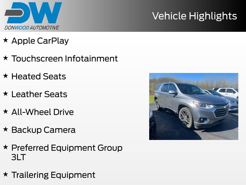 This Chevrolet Traverse LT Leather has many features and is well equipped including, Apple CarPlay, Touchscreen Infotainment, Heated Seats, Leather Seats, All-Wheel Drive, Backup Camera, 3rd row seats: split-bench, 6 Speakers, 7-Passenger Seating (2-2-3 Seating Configuration), Air Conditioning, Apple CarPlay/Android Auto, Brake assist, Delay-off headlights, Dual-Zone Automatic Temperature Control, Electronic Stability Control, Front Bucket Seats, Fully automatic headlights, Heated door mirrors, Heated front seats, Heavy-Duty Cooling System, Hitch Guidance w/Hitch View, Leather-Appointed Seat Trim, Overhead console, Power door mirrors, Power Liftgate, Power passenger seat, Preferred Equipment Group 3LT, Radio: Chevrolet Infotainment 3 Plus System, Rear air conditioning, Remote Keyless Entry, SiriusXM w/360L, Trailering Assist Guidelines, Trailering Equipment.