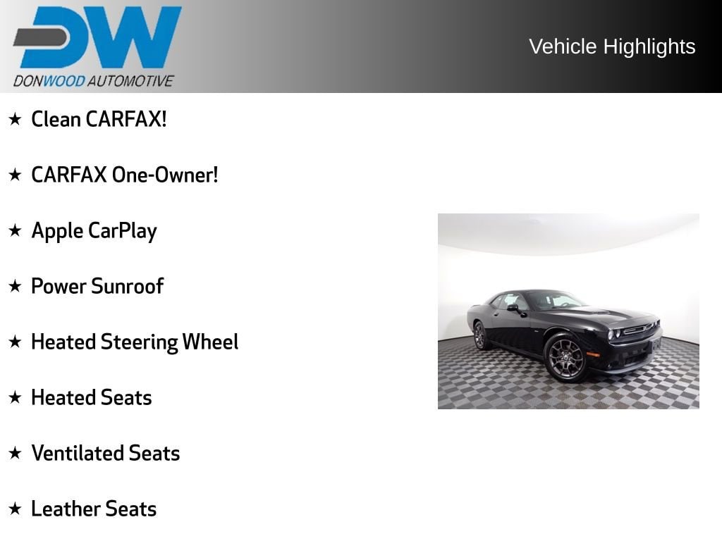 Clean CARFAX! CARFAX One-Owner! This Dodge Challenger GT has many features and is well equipped including, Apple CarPlay, Power Sunroof, Heated Steering Wheel, Heated Seats, Ventilated Seats, Leather Seats, Backup Camera, Great Price, 1-YR SiriusXM Guardian Trial, 5-Year SiriusXM Traffic Service, 5-Year SiriusXM Travel Link Service, 8.4" Touchscreen Display, Alloy wheels, Apple CarPlay, Auto-dimming Rear-View mirror, Beats Audio on 8.4" Touchscreen w/10 Premium Speakers & Subwoofer w/552-Watt Amplifier, Auxiliary Jack & 2 USB Ports, Brake assist, Delay-off headlights, Electronic Stability Control, Fully automatic headlights, Google Android Auto, GPS Antenna Input, GPS Navigation, HD Radio, Heated & Ventilated Front Seats, Heated door mirrors, Heated Front Seats, Heated front seats, Integrated Center Stack Radio, Integrated Voice Command w/Bluetooth, Leather Trim Seats, Media Hub (2 USB, AUX), Panic Alarm, ParkView Rear Back-Up Camera, Power door mirrors, Power Sunroof, Quick Order Package 21B, Radio: Uconnect 4C Nav w/8.4" Display, Security System, SiriusXM Satellite Radio, SiriusXM Traffic Plus, SiriusXM Travel Link, Speed control, Split folding rear seat, USB Host Flip, Ventilated front seats.
