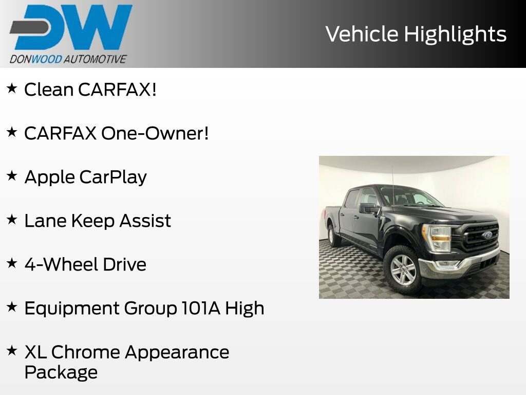 Clean CARFAX! CARFAX One-Owner! This Ford F-150 XL has many features and is well equipped including, Apple CarPlay, Lane Keep Assist, 4-Wheel Drive, 17" Silver Painted Aluminum Wheels, 6 Speakers, Air Conditioning, Auto High-beam Headlights, Brake assist, Chrome Front & Rear Bumpers, Cloth 40/20/40 Front Seat, Cruise Control, Electronic Stability Control, Emergency communication system: SYNC 4 911 Assist, Equipment Group 101A High, Exterior Parking Camera Rear, Fully automatic headlights, Lane-Keeping System, Outside temperature display, Overhead console, Radio: AM/FM Stereo w/6 Speakers, Remote Keyless Entry, Reverse Sensing System, Split folding rear seat, Steering wheel mounted audio controls, SYNC 4, XL Chrome Appearance Package.