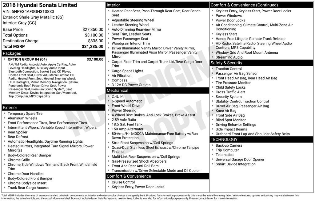 This Hyundai Sonata Limited has many features and is well equipped including, Power Sunroof, Heated Seats, Ventilated Seats, Leather Seats, Backup Camera, ABS Brakes, Air Conditioning, Alloy wheels, Apple CarPlay & Android Auto, Compass, Dual-Zone Automatic Temperature Control, Electronic Stability Control, Exterior Parking Camera Rear, Fully automatic headlights, Heated door mirrors, Heated Front Bucket Seats, Heated front seats, Heated Rear Seats, Illuminated entry, Low Tire Pressure Warning, Panoramic Power Moonroof, Power door mirrors, Remote Keyless Entry, Speed control, Traction Control.