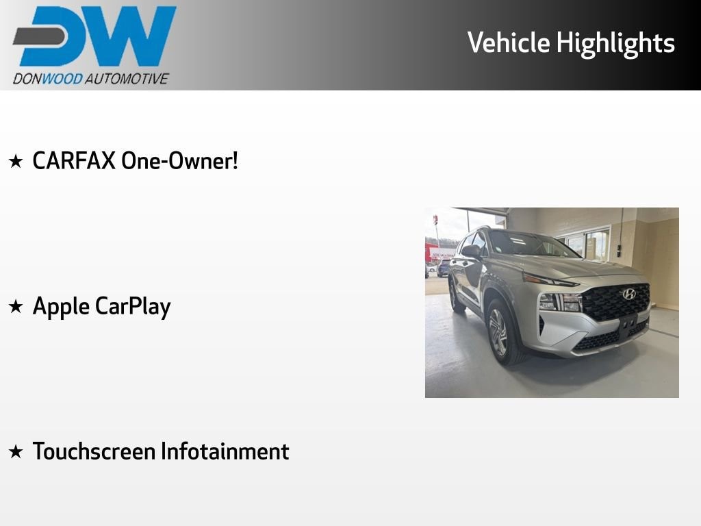 CARFAX One-Owner! This Hyundai Santa Fe SEL has many features and is well equipped including, Apple CarPlay, Touchscreen Infotainment, 6 Speakers, Air Conditioning, Apple CarPlay & Android Auto, Auto High-beam Headlights, Brake assist, Dual-Zone Automatic Temperature Control, Electronic Stability Control, Exterior Parking Camera Rear, Front Bucket Seats, Fully automatic headlights, Heated Front Bucket Seats, Overhead console, Power driver seat, Radio: AM/FM Display Audio, Speed control, Stain-Resistant Cloth Seat Trim, Steering wheel mounted audio controls.