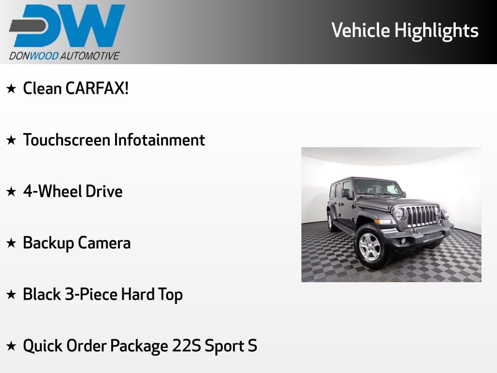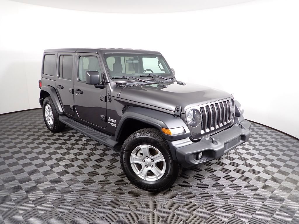 Clean CARFAX! This Jeep Wrangler Unlimited Sport S has many features and is well equipped including, Touchscreen Infotainment, 4-Wheel Drive, Backup Camera, Black 3-Piece Hard Top, Air Conditioning, Automatic Headlamps, Cloth Low-Back Bucket Seats, Deep Tint Sunscreen Windows, Front 1-Touch Down Power Windows, Leather Wrapped Steering Wheel, Power Heated Mirrors, Quick Order Package 22S Sport S, Remote Keyless Entry, Security Alarm, Speed Sensitive Power Locks, Split folding rear seat, Sun Visors w/Illuminated Vanity Mirrors, Wheels: 17" x 7.5" Tech Silver Aluminum.