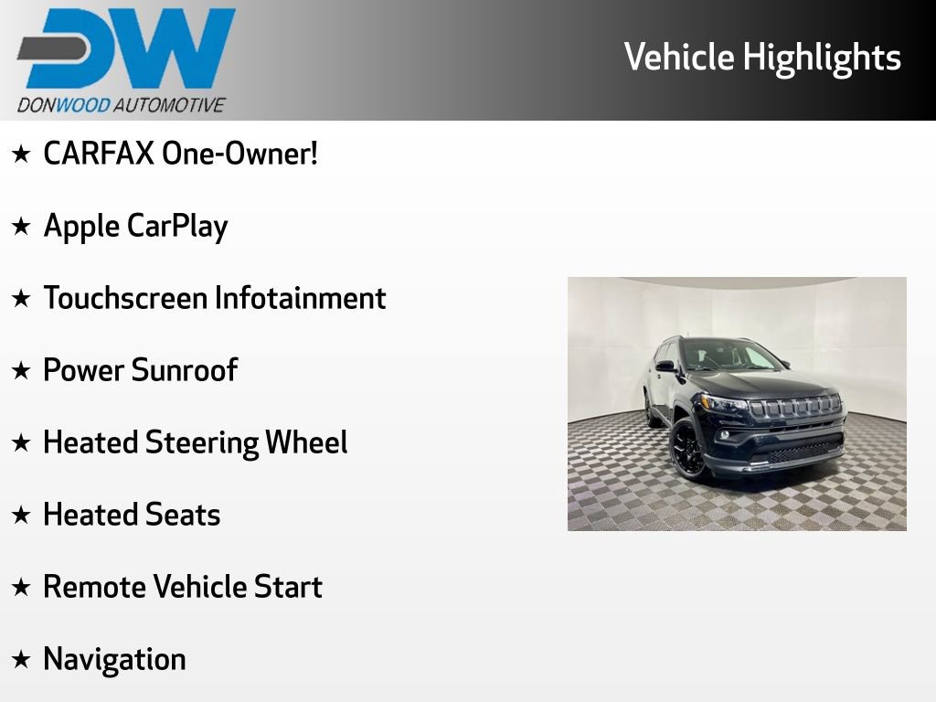 CARFAX One-Owner!, This Jeep Compass Altitude has many features and is well equipped including, Apple CarPlay, Touchscreen Infotainment, Power Sunroof, Heated Steering Wheel, Heated Seats, Remote Vehicle Start, Navigation, 4-Wheel Drive, Backup Camera, 115V Auxiliary Power Outlet, 2nd Row USB Type A/C Charge Only, Air Conditioning ATC w/Dual Zone Control, All-Season Floor Mats, Altitude Special Edition, Auto High-beam Headlights, Auto-Dimming Rear-View Mirror, Black Day Light Opening Moldings, Black Headliner, Black Roof, Brake assist, Bright Exhaust Tip, Convenience Group, Dual-Pane Power Sunroof, Electronic Stability Control, Foot Activated Open 'N Go Liftgate, Fully automatic headlights, Gloss Black Badges, Gloss Black Grille & Crosshairs, Gloss Black Lower Rear Fascia Valance, Heated Front Seats, Heated Steering Wheel, Humidity Sensor, Leather Wrapped Steering Wheel, Light Tungsten Interior Accent Stitching, ParkView Rear Back-Up Camera, Piano Black Interior Accents, Power Adjust 8-Way Driver Seat, Power Liftgate, Premium Alpine 9-Speaker System w/Subwoofer, Quick Order Package 2GB Altitude, Remote Start System, Reversible Carpet/Vinyl Cargo Mat, Security Alarm, Sun and Sound Group, Universal Garage Door Opener, Vehicle Information Center, Wheels: 18" x 7" Gloss Black Painted Aluminum, Windshield Wiper De-Icer.