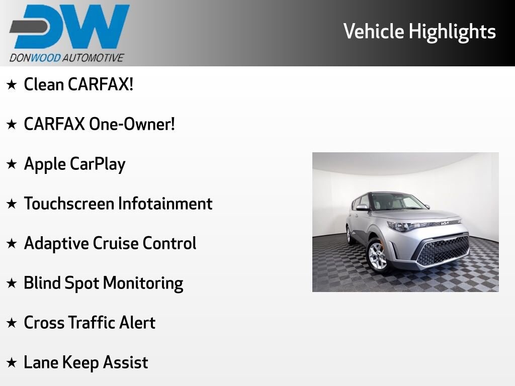 Clean CARFAX!, CARFAX One-Owner!, A complimentary Lifetime Powertrain Limited Warranty is included with this Kia Soul LX!, This Kia Soul LX has many features and is well equipped including, Apple CarPlay, Touchscreen Infotainment, Adaptive Cruise Control, Blind Spot Monitoring, Cross Traffic Alert, Lane Keep Assist, Backup Camera, 6 Speakers, 6.5J x 16" Alloy Wheels, ABS Brakes, Apple CarPlay & Android Auto, Auto High-beam Headlights, Blind-Spot Collision-Avoidance Assist, Compass, Electronic Stability Control, Exterior Parking Camera Rear, Front Bucket Seats, Front Center Armrest, Fully automatic headlights, Illuminated entry, Lane Change Assist, Low Tire Pressure Warning, LX Technology Package, Overhead console, Power door mirrors, Radio: AM/FM/MP3/HD Audio System, Rear Cross-Traffic Collision Avoidance Assist, Remote Keyless Entry, Split folding rear seat, Traction Control, Woven & Tricot Cloth Seat Trim.