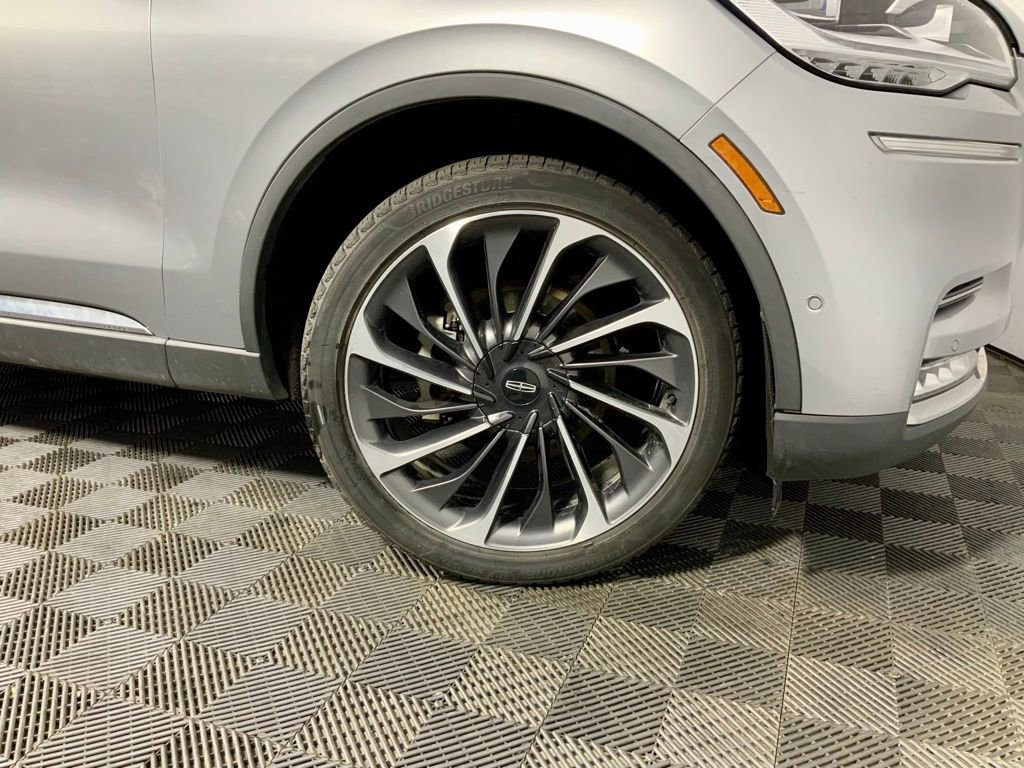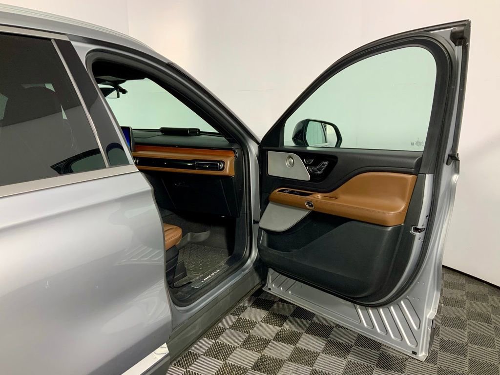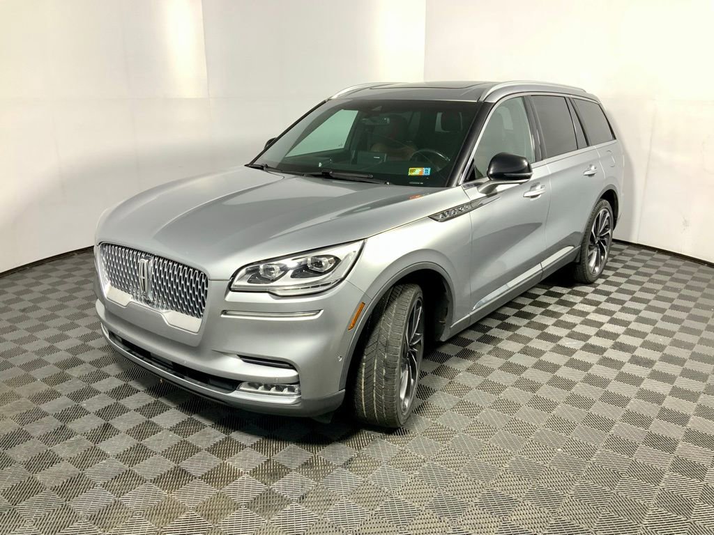 2020 Lincoln Aviator Reserve AWD. Dressed in elegant Silver Radiance Metallic, this premium SUV blends sophisticated design with bold presence, highlighted by a signature chrome grille, sleek LED lighting, and striking 22-inch ultra-bright machined aluminum wheels. A panoramic Vista Roof with power shade adds an open, airy feel, enhancing every journey.