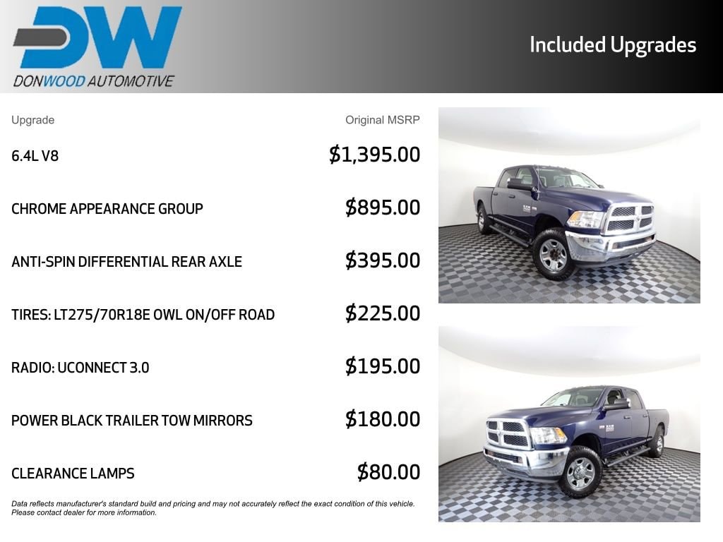 Clean CARFAX!, Anti-Spin Differential Rear Axle, Bright Front Bumper, Bright Grille, Bright Rear Bumper, Chrome Appearance Group, Front Armrest w/Cupholders, Heated door mirrors, Heavy Duty Vinyl 40/20/40 Split Bench Seat, Quick Order Package 22A Tradesman, Storage Tray, Trailer Tow Mirrors, Wheels: 18 x 8.0 Steel Chrome Clad.