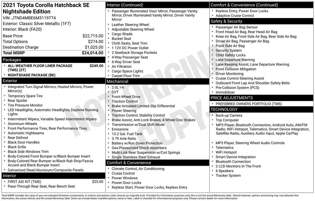 A short drive from Athens, Cambridge, Chillicothe, Circleville, Columbus, Lancaster, Logan, Marietta, Nelsonville, Newark, Pickerington, Pomeroy, and Zanesville in Ohio, as well as Charleston, Clarksburg, Huntington, Morgantown, Parkersburg, Vienna, and Wheeling in West Virginia. 900 East State St. Athens, OH 45701. Near Ohio University! Down the road from Hocking Hills! Vehicle: 2021 Toyota Corolla Hatchback SE Nightshade Edition Price: 17351 (live market adjusted) CarFax: True, available today Stock#: T119774P | VIN Ending: JTND4MBE6M3119774 Delivery: Nationwide delivery available.