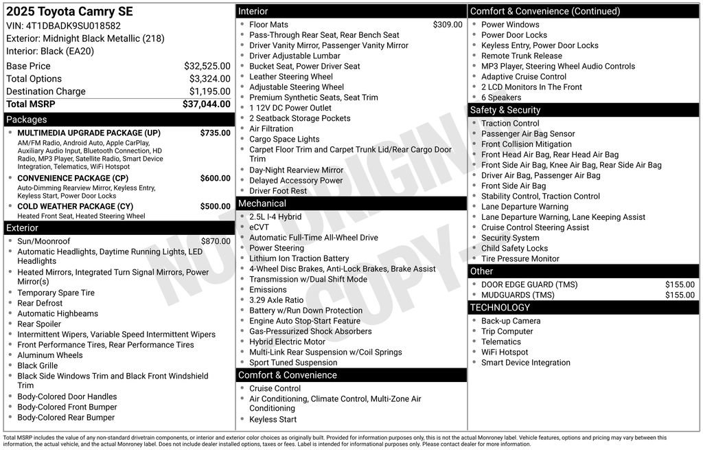 A short drive from Athens, Cambridge, Chillicothe, Circleville, Columbus, Lancaster, Logan, Marietta, Nelsonville, Newark, Pickerington, Sandusky, and Zanesville in Ohio, as well as Charleston, Clarksburg, Huntington, Morgantown, Parkersburg, Vienna, and Wheeling in West Virginia. 27350 Darl Rd. Rockbridge, OH 43149. Located in the Hocking Hills! Close to Ohio University! Vehicle: 2025 Toyota Camry SE Price: (live market adjusted) CarFax: True, available today Stock#: J794874BT | VIN Ending: 4T1DBADK9SU018582 Delivery: Nationwide delivery available.